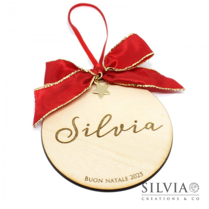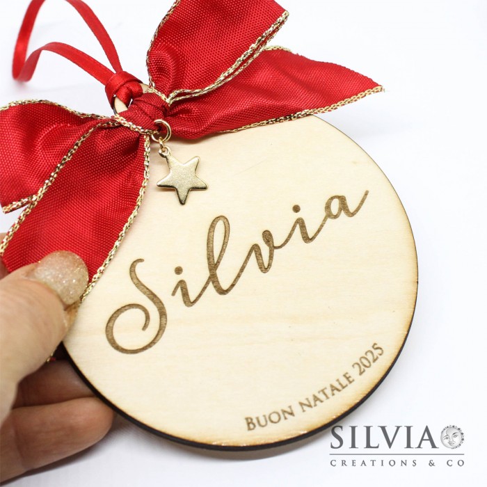 Questa creazione viene realizzata con l'incisore su legno. Si tratta di una pallina tonda con un nome e una breve frase di buon augurio.