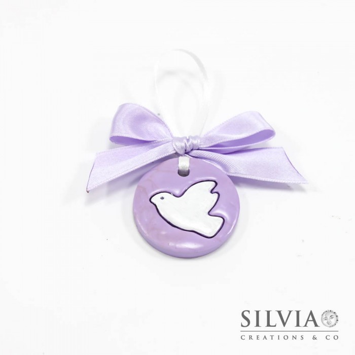 Formella con tondo lilla e colomba per cresima