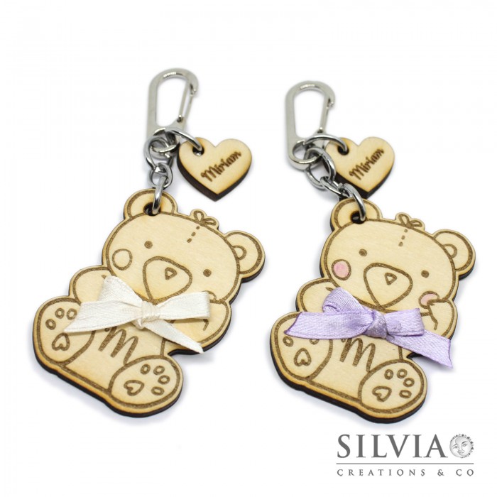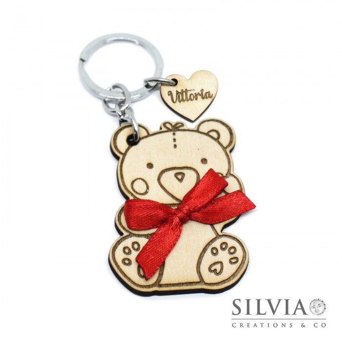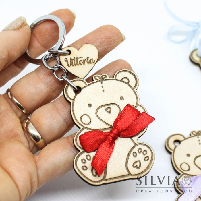 La sagoma dell'orsetto in legno misura 5,5x4 cm e ha una spessore di 3 mm e l'ho assemblato con una catenella e un anello portachiavi nel quale ho inserito anche un cuore su cui inciderò un nome.