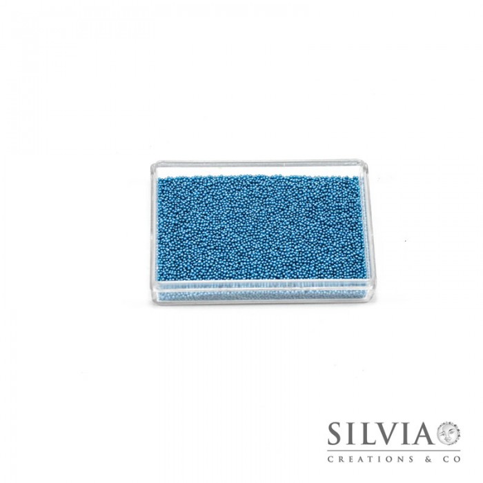 Microsfere di vetro color azzurro perlato senza foro da 0,7 mm, confezione da 50 grammi. Queste microsfere sono ideali per decorare gli oggetti realizzati con paste polimeriche (es. fimo) o per riempire le bottigliette di vetro.