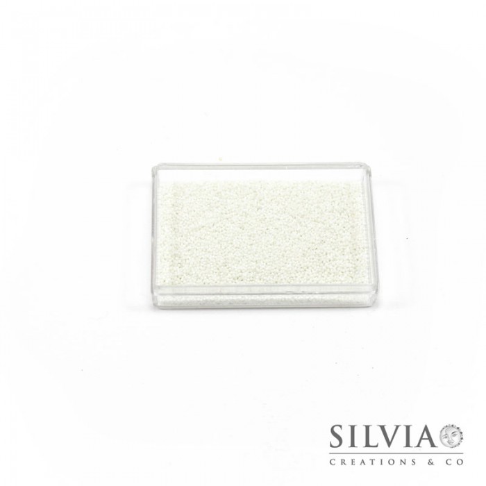 Microsfere di vetro color bianco perlato senza foro da 0,7 mm, confezione da 50 grammi. Queste microsfere sono ideali per decorare gli oggetti realizzati con paste polimeriche (es. fimo). La colorazione bianca può ricordare la granella di zucchero da applicare alle vostre dolci creazioni. Oppure possono essere utilizzate per riempire le bottigliette di vetro.