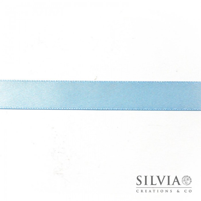 Nastro doppio raso color azzurro chiaro da 15 mm. Ideale per confezionare bomboniere, decorare pacchi regalo, ecc. Questo prodotto è venduto su rotolo da 50 metri.