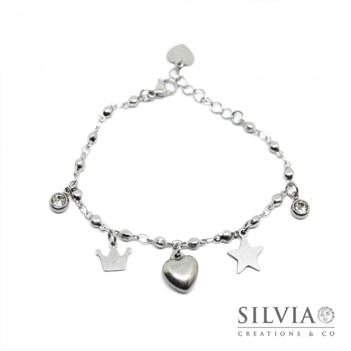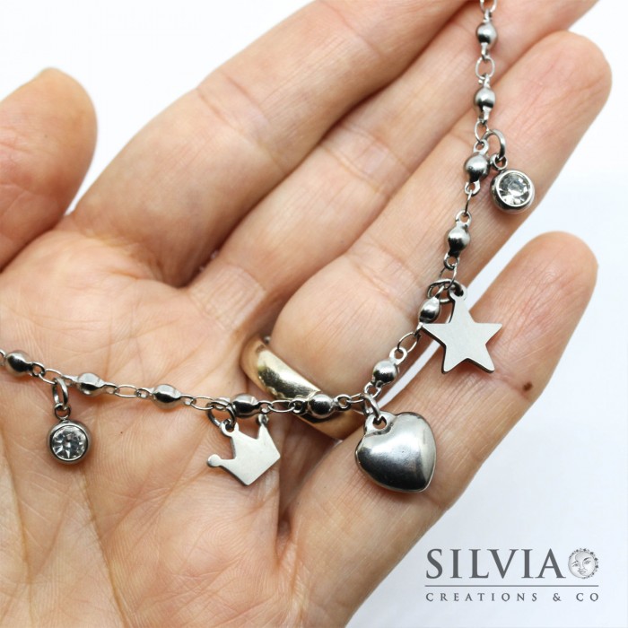 Per realizzare questo braccialetto ho utilizzato come base una catena in acciaio con palline da 4 mm a cui ho fissato diversi ciondoli: due cristalli, un cuore in acciaio, una corona e una stella.