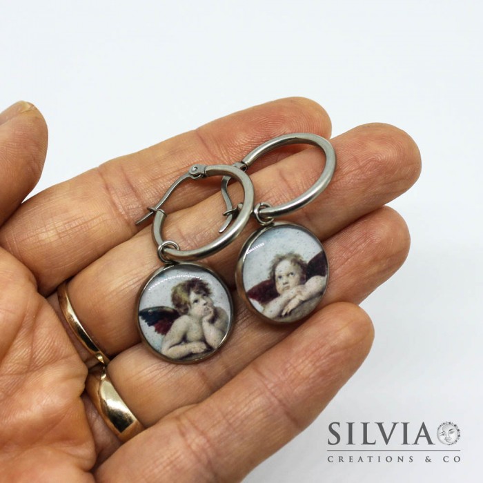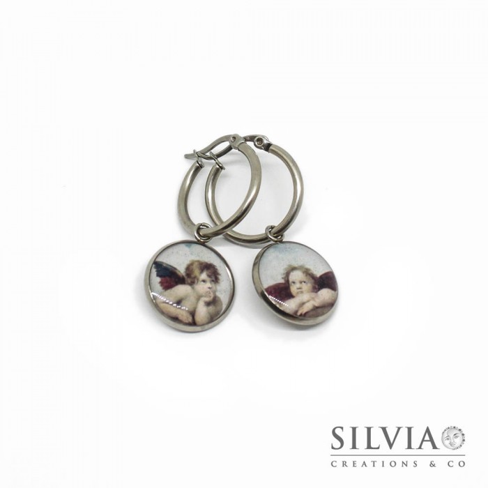 Orecchini a cerchio in acciaio con ciondolo angeli di Raffaello