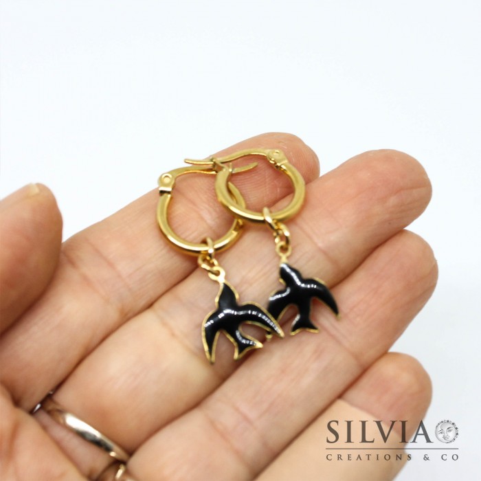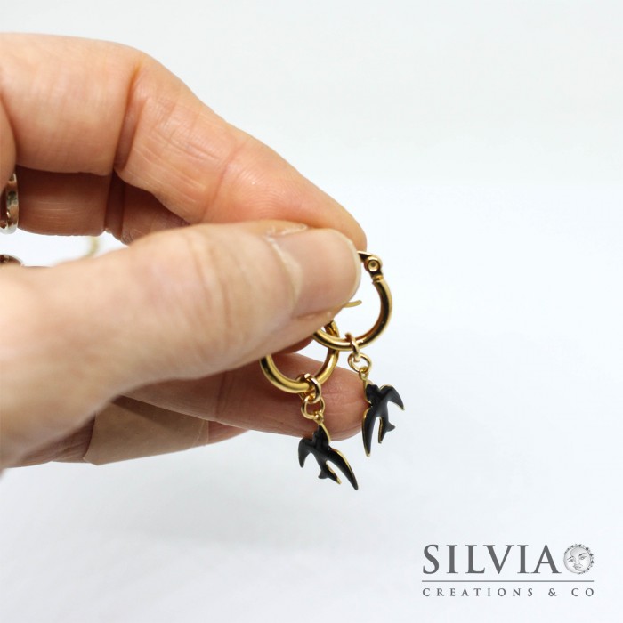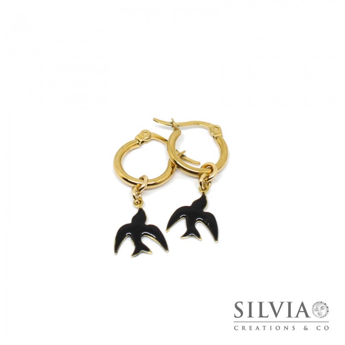 Orecchini a cerchio hops in acciaio dorato con ciondolo rondine nera