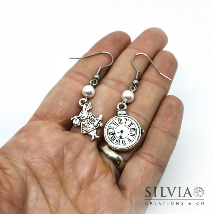 Orecchini pendenti Alice nel paese delle meraviglie bianconiglio e orologio