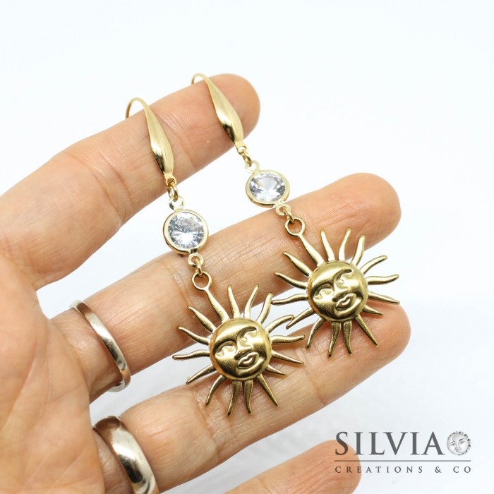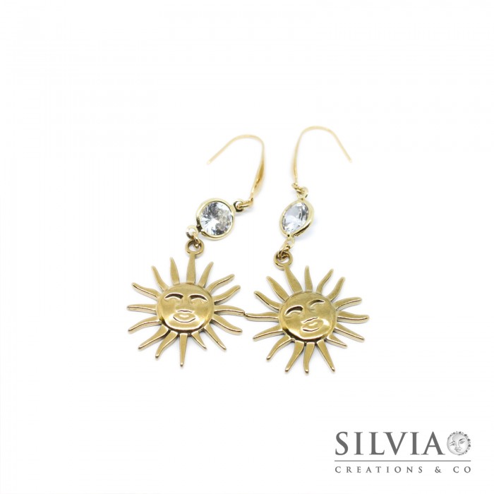 Orecchini in acciaio dorato ciondolo sole e cristallo