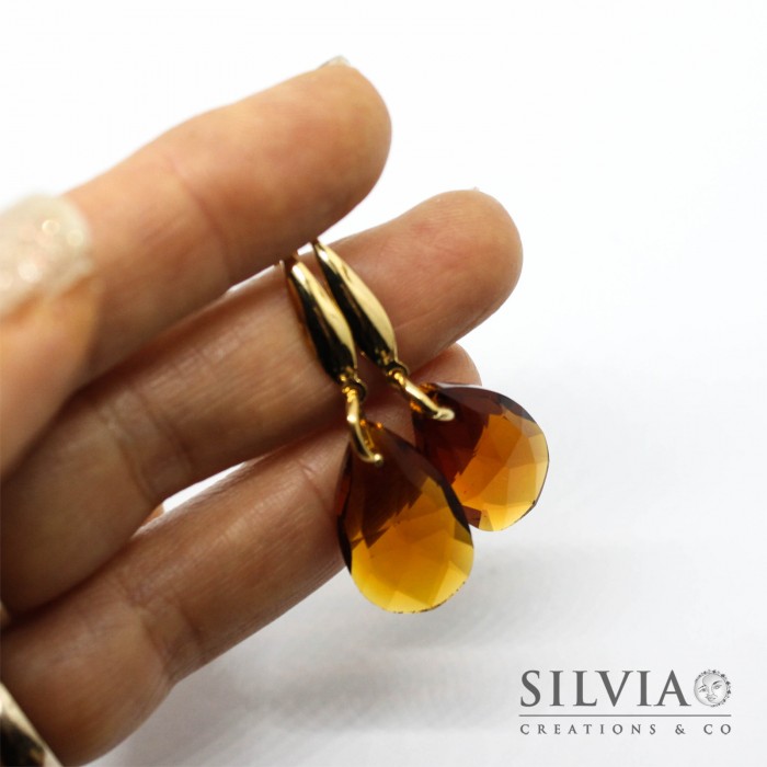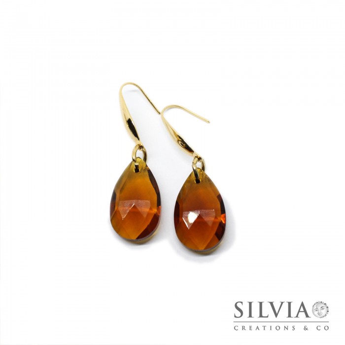 Orecchini in acciaio dorato lacrima di cristallo sfaccettato color caramello