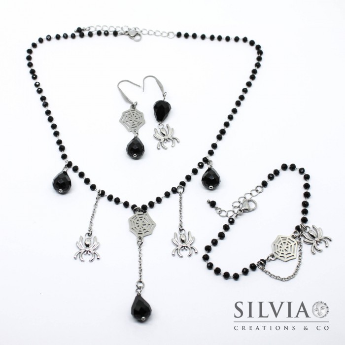 Collana girocollo cristalli neri con ragnatela ragni e gocce