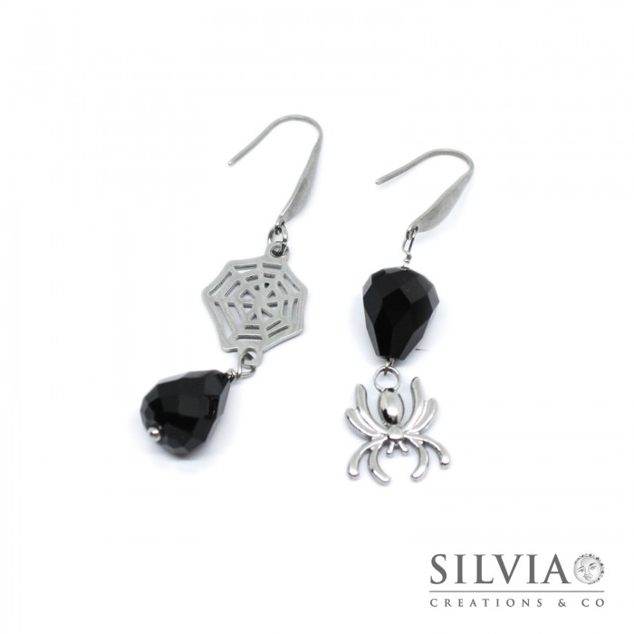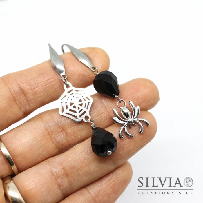 Ho creato questi orecchini pendenti con delle monachelle in acciaio, due gocce di cristallo nere, un connettore a forma di ragnatela e un ciondolo ragno tutto in acciaio.