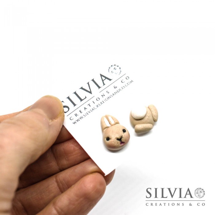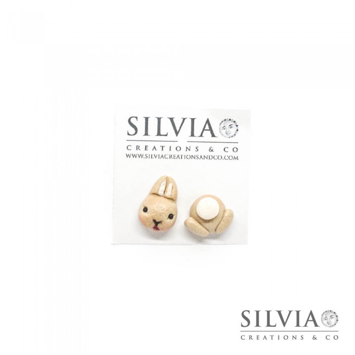Ho realizzato questi orecchini creando a mano in fimo due soggetti rappresentanti il musetto di un coniglio color beige e la parte posteriore del coniglietto con la coda bianca. Entrambi i soggetti sono realizzati in stile Kawaii.