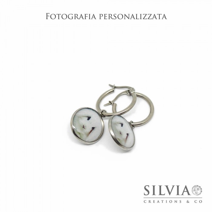 Ho realizzato questi orecchini utilizzando una base in acciaio a cerchio da 2 cm di diametro. All'interno del cerchio ho inserito due ciondoli costituiti da una base cabochon rotonda contenente l'immagine del vostro cucciolo. L'ho realizzato utilizzando la tecnica della resina colata. Questa tecnica consiste nella colatura di uno strato di resina all’interno di un cabochon rendendo impermeabile e incorruttibile il suo contenuto. Il cabochon che ho utilizzato è in acciaio e misura 16 mm di diametro.