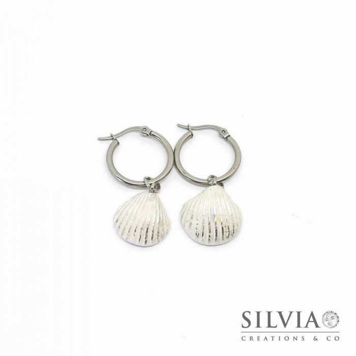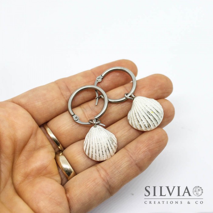 Orecchini pendenti con cerchio in acciaio e conchiglia bianca e argento