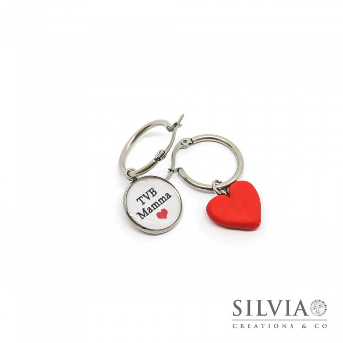Orecchini cerchio in acciaio ciondolo "TVB Mamma" e cuore rosso