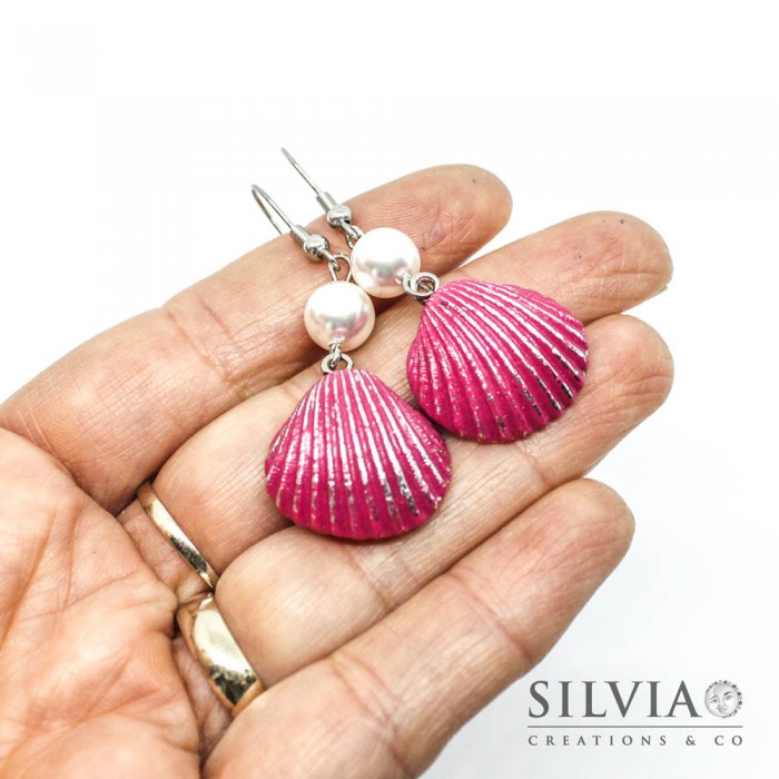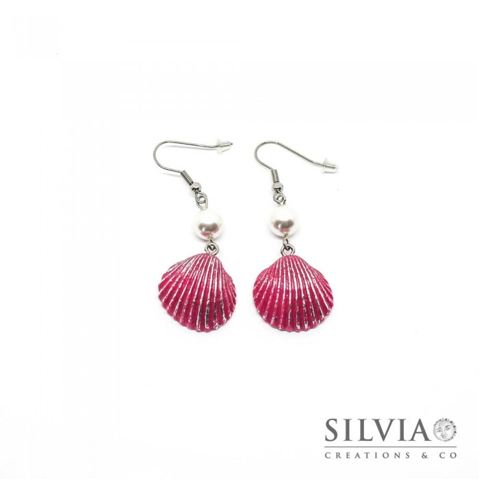 Orecchini pendenti con conchiglia fucsia e argento 55x20 mm