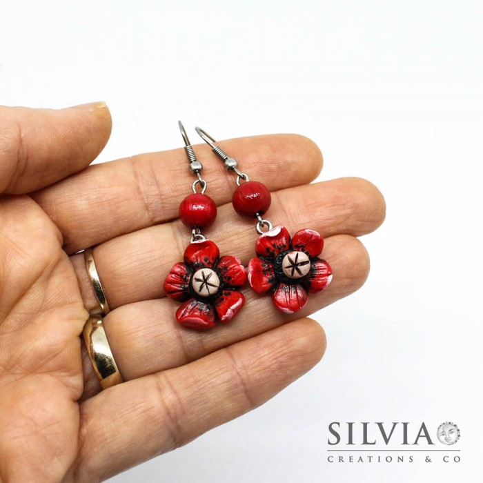 perle di legno. Il ciondolo misura circa 18 mm ed è a forma di fiore papavero rosso. Questo fiore è fissato ad una perla di legno rossa da 8 mm. Le