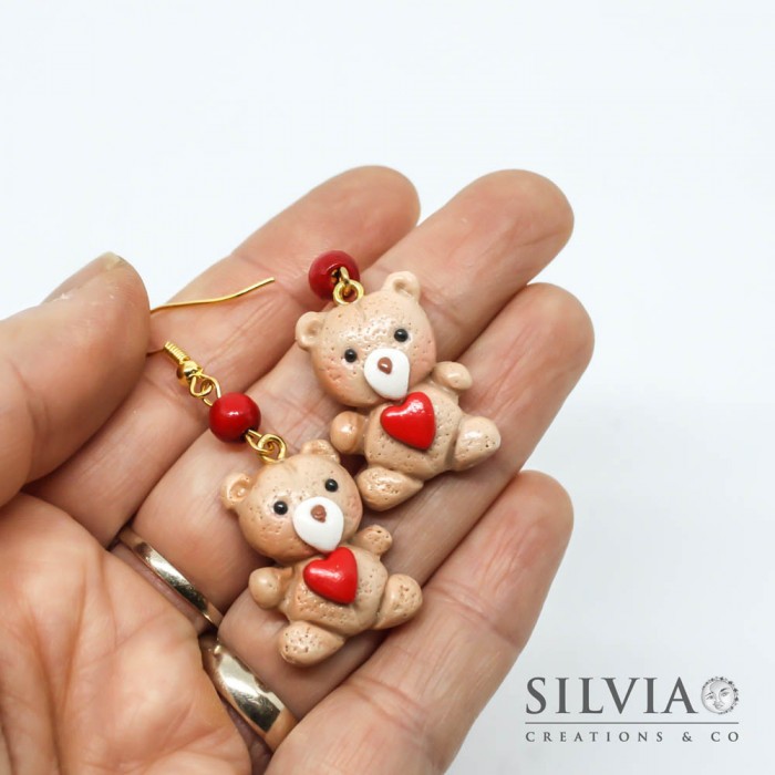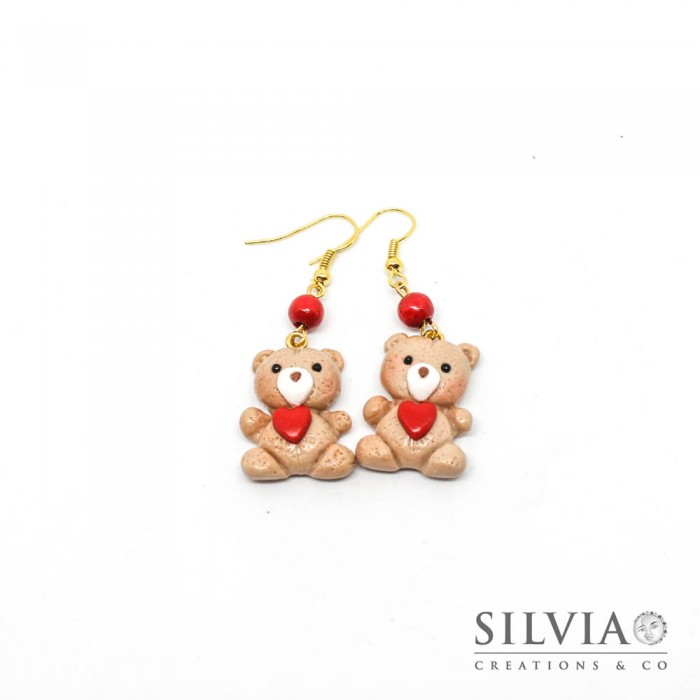Orecchini pendenti con orsetto peluche e cuore rosso