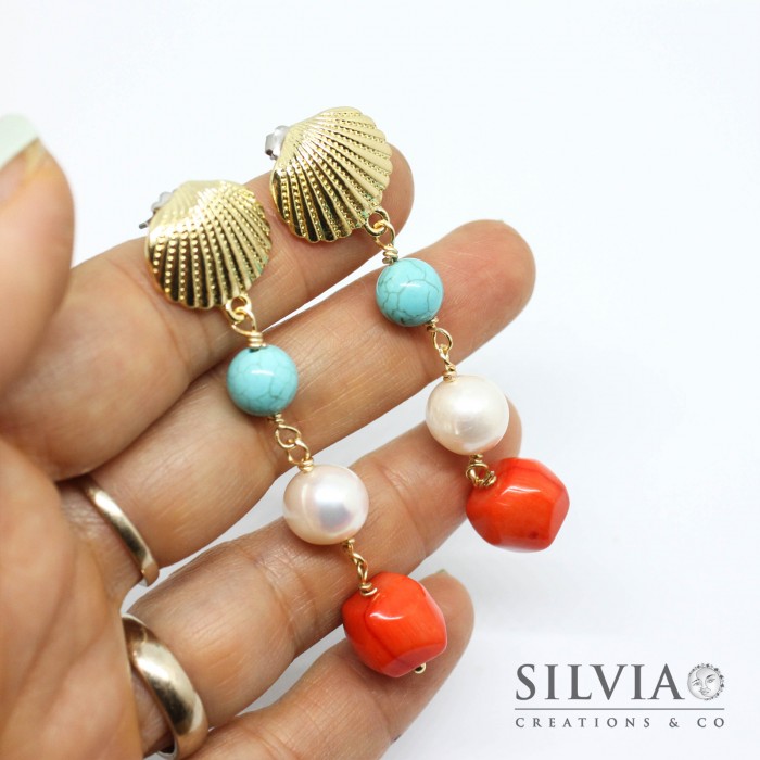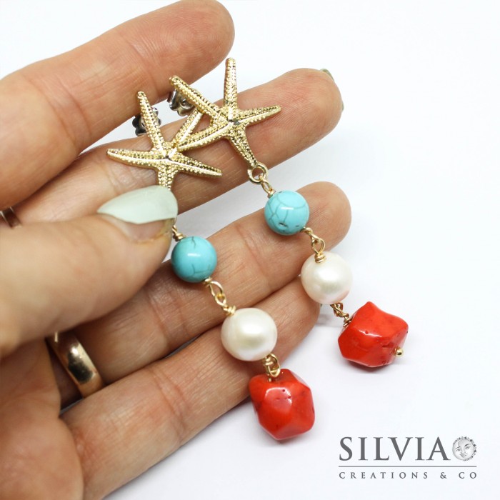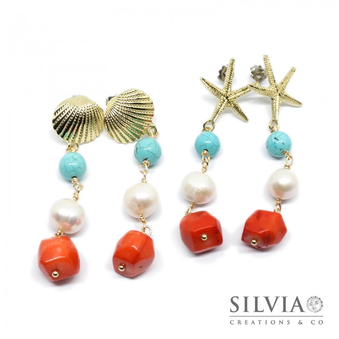 Orecchini pendenti a perno con stella marina o conchiglia turchese perla e corallo
