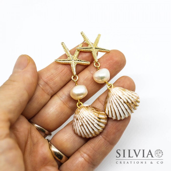 Orecchini pendenti a perno con stella marina perla e conchiglia bianca e oro