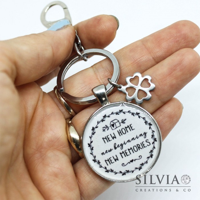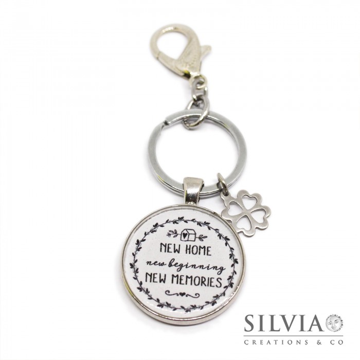 Per realizzare questo portachiavi ho utilizzato un moschettone e un anello brisè in zama. Il ciondolo principale è costituito da una base cabochon rotonda contenente un'immagine con la scritta "New home, new beginning, new memories". Questo soggetto è stato realizzato utilizzando la tecnica della resina colata. Questa tecnica consiste nella colatura di uno strato di resina all’interno di un cabochon che rende impermeabile e incorruttibile il suo contenuto. Il ciondolo che ho utilizzato è in zama e misura 3 cm di diametro.