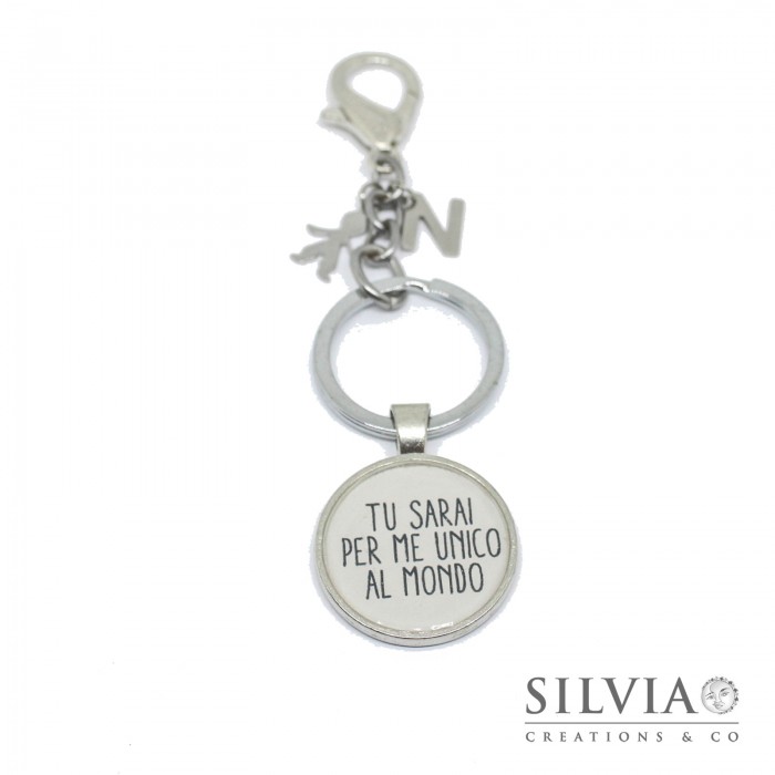 Per realizzare questo portachiavi ho utilizzato un moschettone, una catena e un anello brisè in zama. Il ciondolo principale è costituito da una base cabochon rotonda contenente un'immagine con la scritta "TU SARAI PER ME UNICO AL MONDO" frase tratta dal Piccolo Principe. Questo soggetto è stato realizzato utilizzando la tecnica della resina colata. Questa tecnica consiste nella colatura di uno strato di resina all’interno di un cabochon rendendo impermeabile e incorruttibile il suo contenuto. Il cabochon che ho utilizzato è in zama e misura 25 mm di diametro.