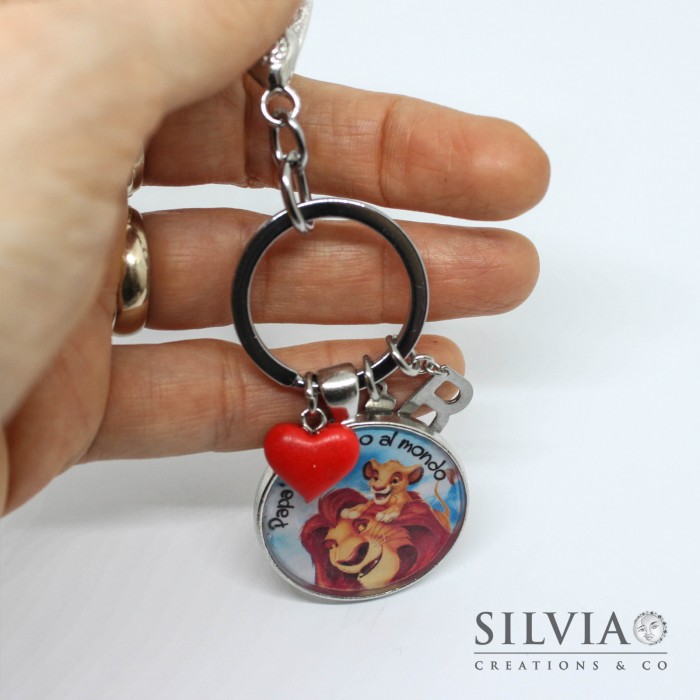 Per realizzare questo portachiavi ho utilizzato un anello e un moschettone. Il ciondolo principale è costituito da una base cabochon tonda contenente un'immagine con la scritta Papà sei unico al mondo e sullo sfondo ho aggiunto l'immagine del Re Leone e di Simba. Questo soggetto è stato realizzato utilizzando la tecnica della resina colata. Questa tecnica consiste nella colatura di uno strato di resina all’interno di un cabochon rendendo impermeabile e incorruttibile il suo contenuto. Il cabochon che ho utilizzato è in zama e misura 30 mm di diametro.