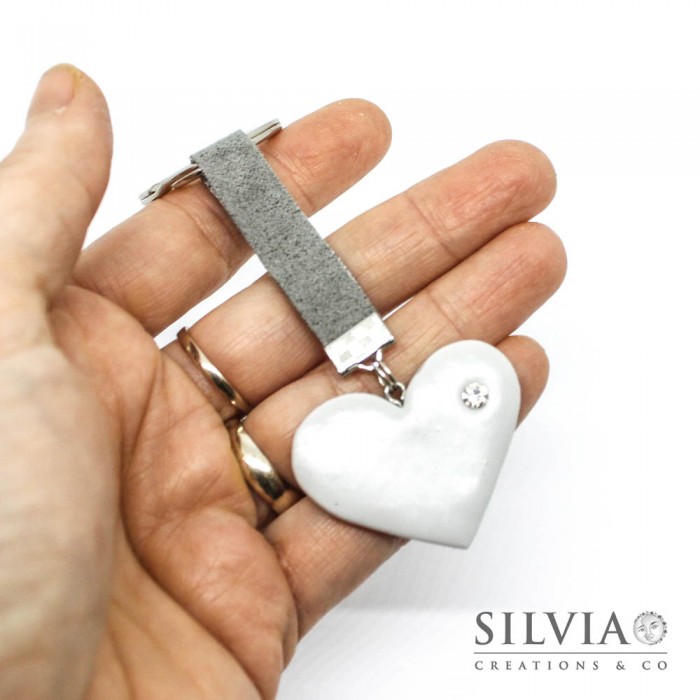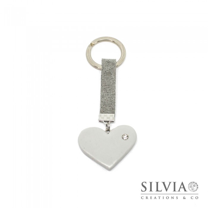 Ho realizzato questo portachiavi creando un soggetto fatto a mano in fimo. Il ciondolo misura 40x30 mm ed è a forma di cuore color grigio con cabochon Swarovski da 3 mm sul lato destro del soggetto. Questo è fissato ad un laccetto in tessuto simil alcantara (effetto pelle scamosciata) color grigio e ad un anello brisè portachiavi in zama color argento da 3 cm. La lunghezza complessiva del portachiavi è di circa 12 cm.