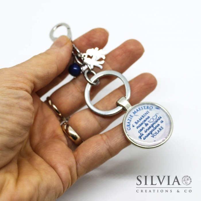 Per realizzare questo portachiavi ho utilizzato un moschettone, una catena e un anello brisè in zama. Il ciondolo principale è costituito da una base cabochon rotonda contenente un'immagine con la scritta "i bambini nascono con le ali, gli insegnanti insegnano a volare", in alto ad arco ho scritto GRAZIE MAESTRO, in basso l'anno scolastico e intorno un cielo con degli uccelli che volano. Questo soggetto è stato realizzato utilizzando la tecnica della resina colata. Questa tecnica consiste nella colatura di uno strato di resina all’interno di un cabochon che rende impermeabile e incorruttibile il suo contenuto. Il cabochon che ho utilizzato è in zama e misura 25 mm di diametro.