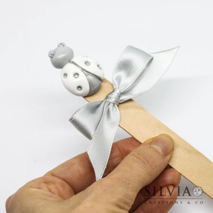 Segnalibro paletta di legno con coccinella bianca e grigia