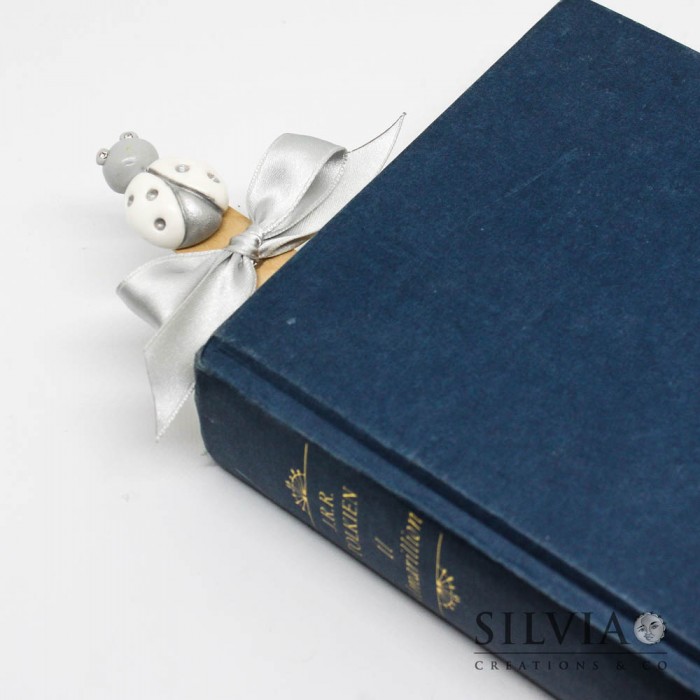 Ho realizzato questo segnalibro portafortuna con una paletta di legno e un ciondolo fatto a mano in fimo. Il ciondolo misura circa 33x22 mm ed è a forma di coccinella bianca e grigia con 6 pallini argento sul corpo e due cristalli sulle antenne. Questo è incollato ad una paletta di legno naturale da 150x18 mm decorato con un fiocchetto di raso grigio.
