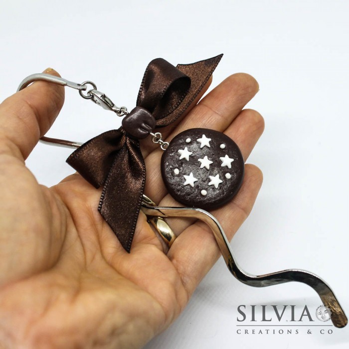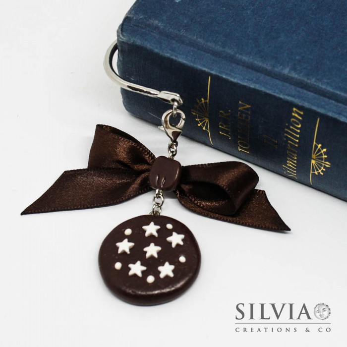 sintetica fimo. Il soggetto misura circa 3 cm e rappresenta un biscotto pan di stelle. Questa creazione è fissata ad un fiocchetto di raso marrone e ad un moschettone in zama color rodio. Grazie al moschettone è possibile