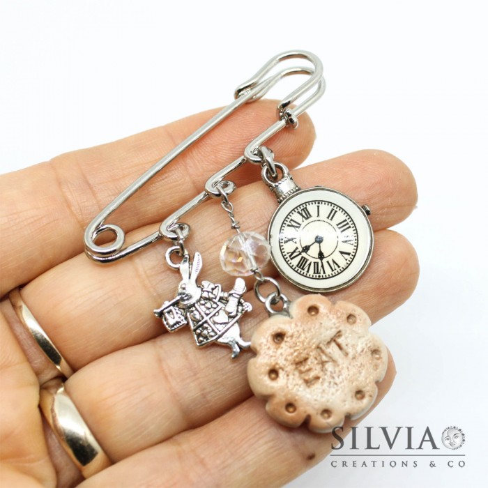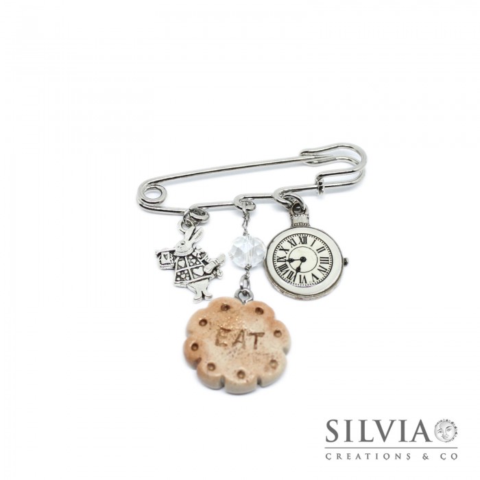 Per tutti gli appassionati del mondo delle meraviglie di Alice, ho realizzato questa spilla con tre ciondoli: un biscotto con scritto EAT fatto a mano in pasta sintetica, il bianconiglio e l'orologio.