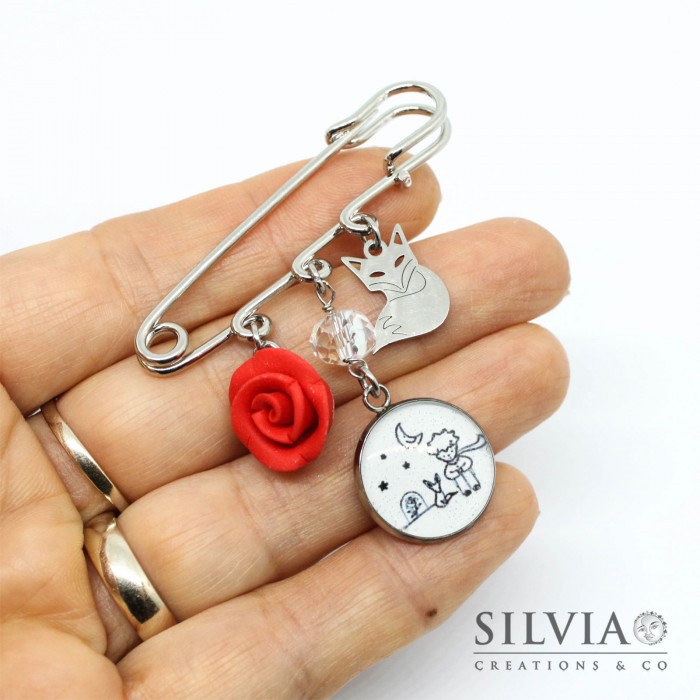 Per tutti gli appassionati dell'opera letteraria de "Il Piccolo Principe", ho realizzato questa spilla con tre ciondoli: una rosa rossa fatta a mano in pasta sintetica, un ciondolo con disegno realizzato a mano e una volpe in acciaio.