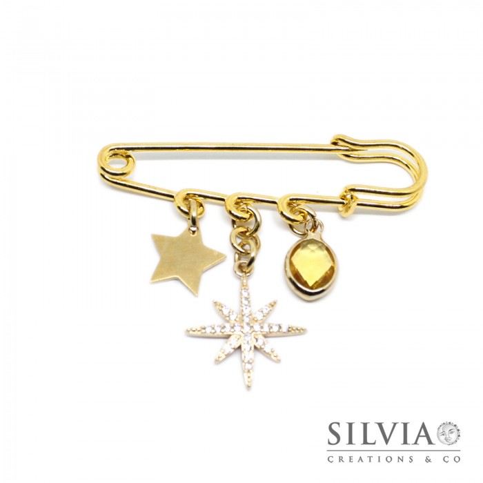 Ho realizzato questa spilla con tre ciondoli, una stella in ottone dorato con zirconi, una stella in acciaio dorato e una goccia in cristallo color oro.